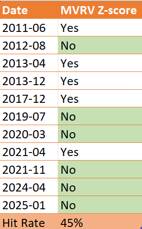 MVRV Z-Score:历史上识别市场顶部的表现(2011–2025)