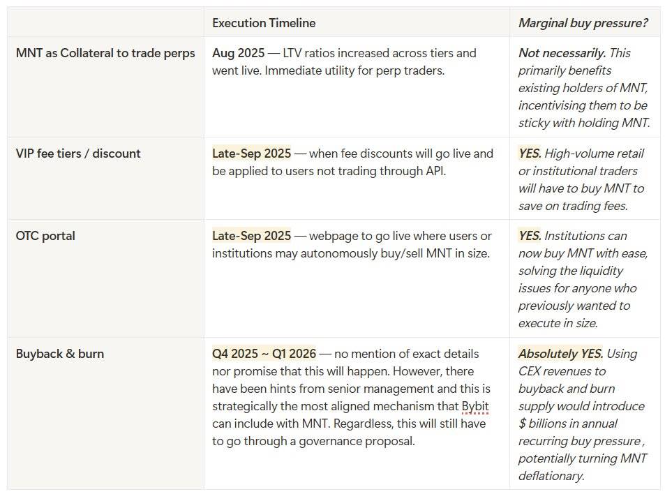 • Bybit 整合的关键催化剂包括增强的抵押品使用、VIP 费用等级和潜在的回购与销毁机制,大部分将在 2025 年 9 月底前推出。