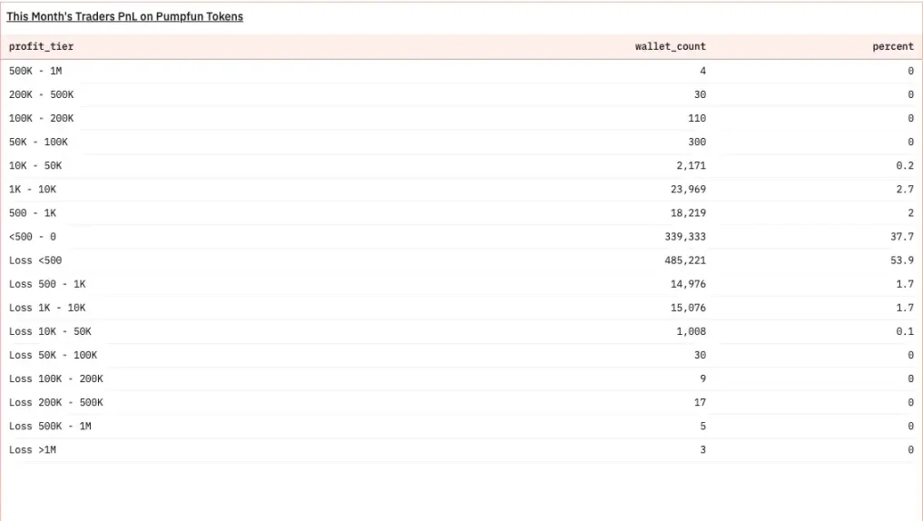 参与 pumpfun 玩家的赚钱与损失比例,此前 ( 亏损:赚钱 ) 的比例在 7:3 上下浮动,而现在达到了 6:4,但赚钱和亏钱的范围几乎集中在了 +—500 美元,Memecoins 的财富效应正在消失,源:DUNE
