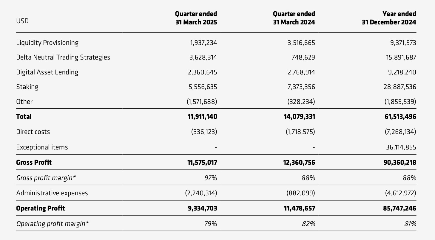 在占比最高的资管业务上,CoinShares 一季度录得 2956.6 万美元收入,占总收入的约 74%,同比增长约 20.8%。除去直接成本和行政费用后的利润约 2271.4 万美元,同比小幅增长约 5%。